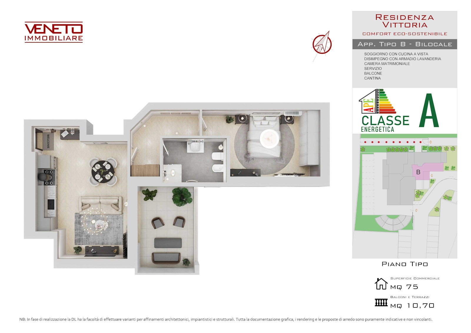 Comfort, luce naturale e funzionalità si fondono in questo bilocale di 75 mq commeriali, pensato per offrire ambienti accoglienti e un comodo balcone vivibile di 10,70 mq, ideale per relax all’aperto. Completo di cantina.