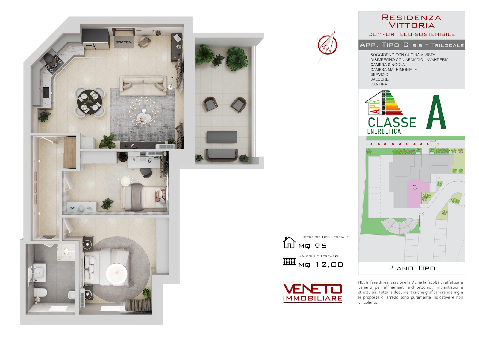 Questo trilocale di 96 mq ti offre spazi generosi, una distribuzione intelligente e un balcone vivibile e confortevole da 15,50 mq per momenti di relax all’aria aperta.