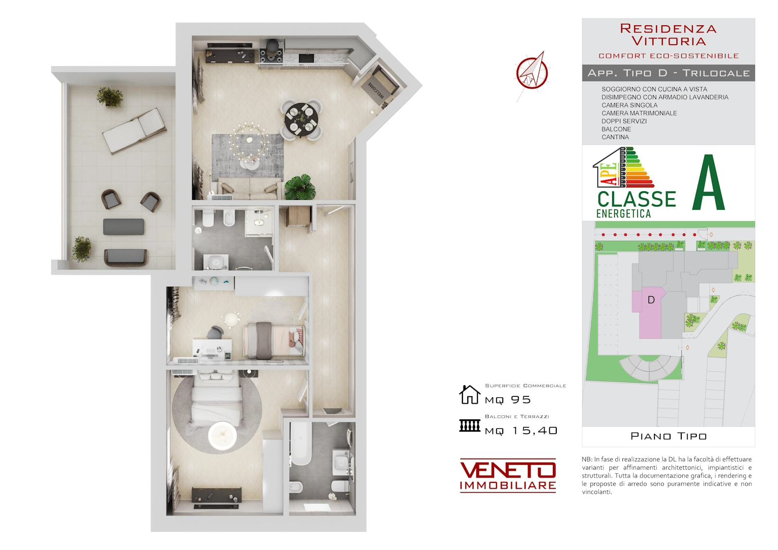 Trilocale di 95 mq commerciali dal design moderno, con ambienti luminosi, pratici e un grande balcone da 15,40 mq per vivere al meglio gli spazi esterni.